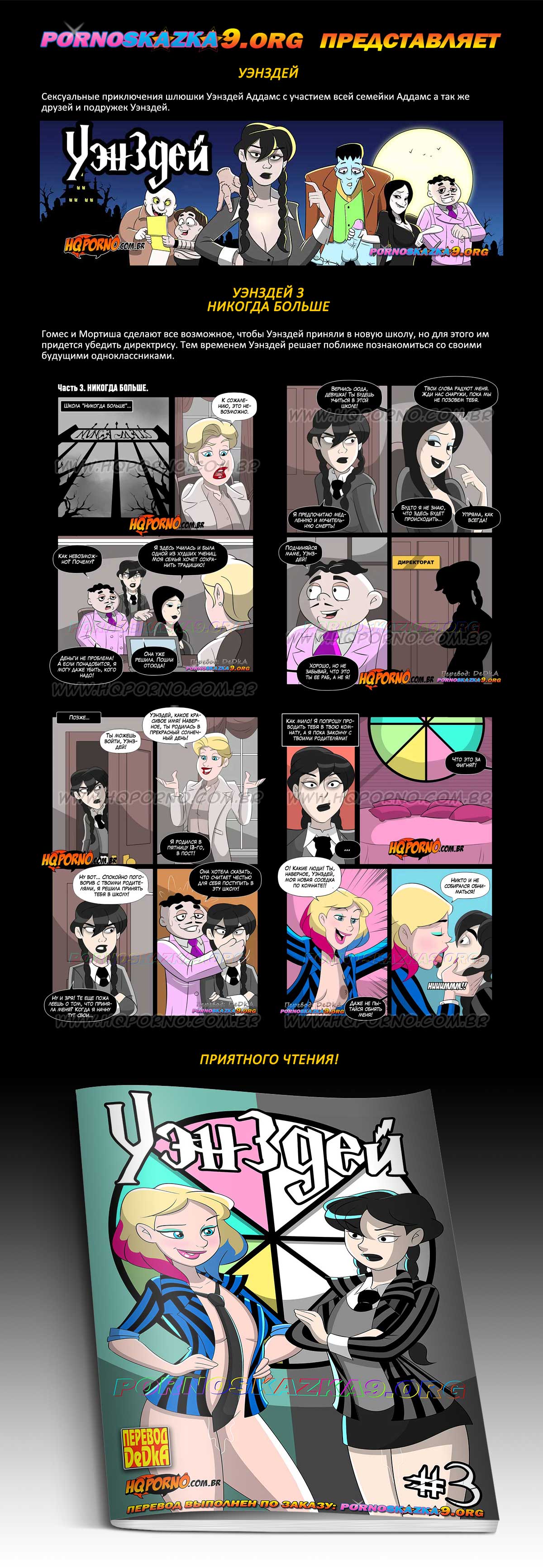 Порно комикс «Уэнздей. Часть 3. Никогда больше.» Гомес собирается пойти и узнать, что Уэнздей натворила в бассейне с помощью коварных рыбок, пираний (об этом рассказано в первой части комикса), а жена Гомеса, Мортиша, собирается воспользоваться его отсутствием и с помошью погонщика наставить на его голову пару массивных рогов, но Гомес что-то заподозрил, и решил проверить свои подозрения…